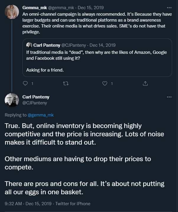 True. But, online inventory is becoming highly competitive and the price is increasing. Lots of noise makes it difficult to stand out. Other mediums are having to drop their prices to compete. There are pros and cons for all. It’s about not putting all our eggs in one basket.