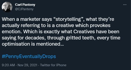 When a marketer says “storytelling”, what they’re actually referring to is a creative which provokes emotion. Which is exactly what Creatives have been saying for decades, through gritted teeth, every time optimisation is mentioned…