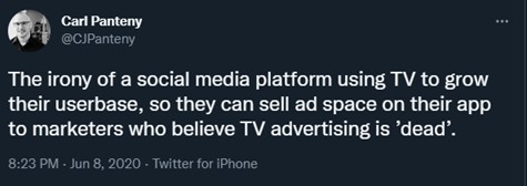 The irony of a social media platform using TV to grow their userbase, so they can sell ad space on their app to marketers who believe TV advertising is ‘dead.’